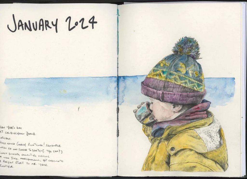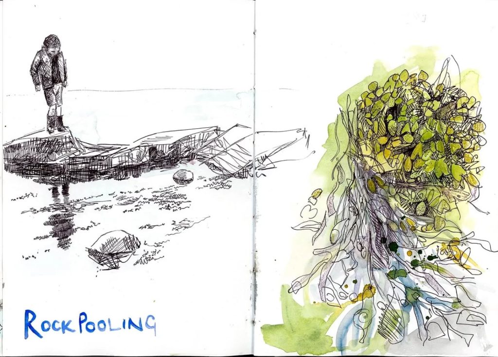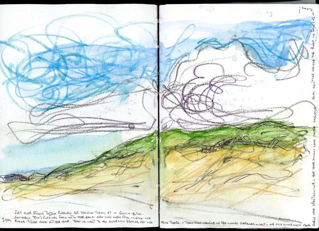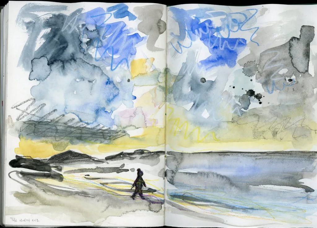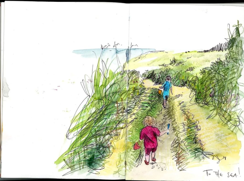 これまでのスケッチブックをじっくり見ていると、海辺にいるときの感覚、波の音、潮風の香り、カモメの声、かすかな魚のにおい、子どもたちの元気にはしゃぐ声を思い出しました。