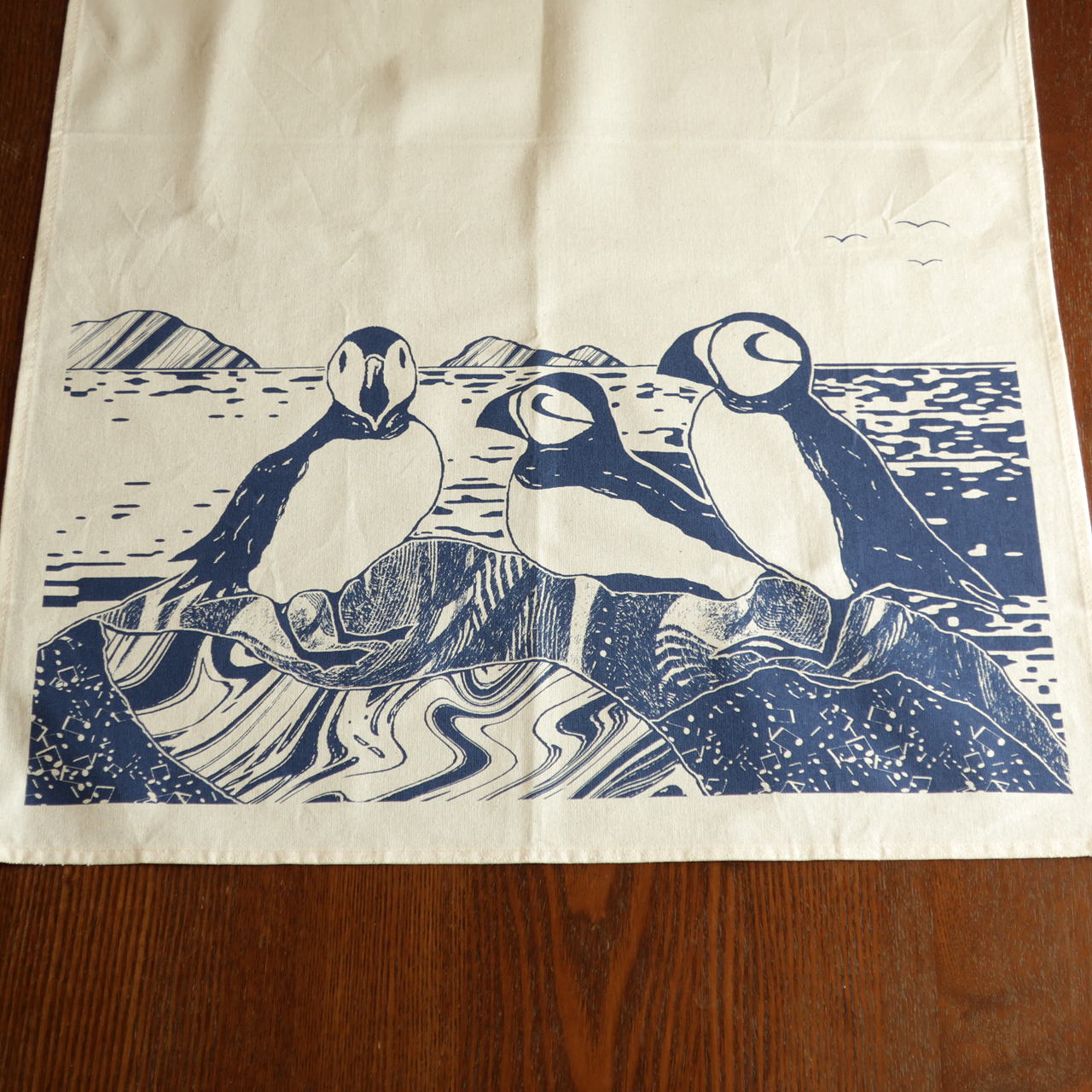 スケッチして写真を撮り、バードウォッチングで見たこちらをじっと見つめるような表情のパフィンたちの様子を作品にしました。